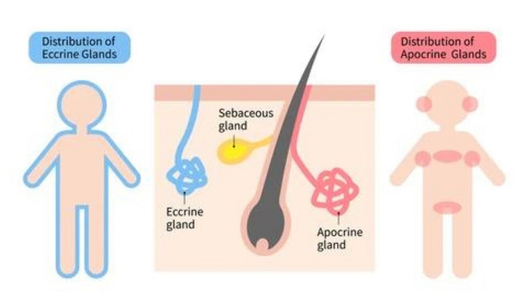 エクリン汗腺から出る汗は約99 %が水で、塩分やアミノ酸、尿酸などを含んで無臭であるのに対し、アポクリン腺から出る汗は白く濁っていて、タンパク質・脂質・脂肪酸などを多く含んでおり、これらの成分は常在菌と一緒になると臭いを発生します。