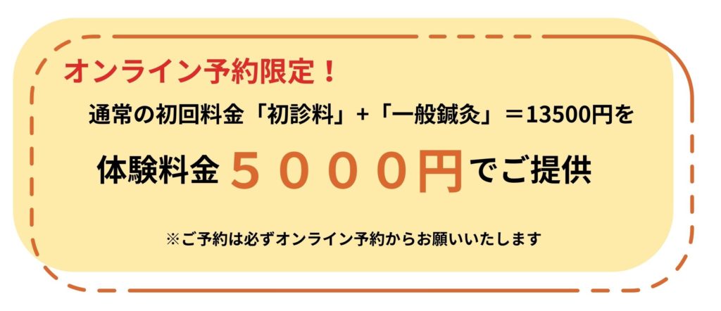 体験料金5,000円で受けられる鍼灸治療トライアルのご案内をご覧ください。
